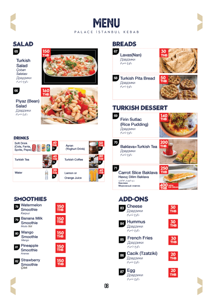 Palace Istanbul Kebab brings the authentic flavors and vibrant culture of Turkey to Pattaya. Enjoy freshly grilled kebabs, mezes, and traditional dishes made with care, passion, and the finest ingredients. Every bite tells a story of Turkish heritage, served with the warmth and generosity that define our culture.